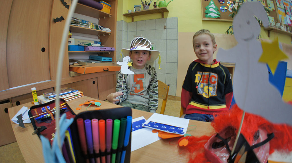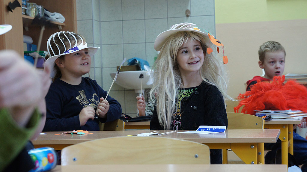 28.10.2011. Dzisiaj było święto duchów. Do naszej klasy zawitały pająki, nietoperze oraz dynie. Jest ich całe mnóstwo! Wiszą pod sufitem, siedzą na szafkach i oknach. Pani zorganizowała nam kilka ciekawych zajęć: samodzielnie wykonaliśmy papierowe dynie, duszki oraz nietoperze, malowaliśmy straszne rzeczy na białych balonach i bawiliśmy się w łowienie na wędkę karteczek z obrazkiem do kolorowania. Niektóre dzieci przebrały się za postaci związane z Halloween, co widać na zdjęciach. A wszyscy mieliśmy pomalowane buzie, głównie „na wampira”. Zabawa był super. Ciekawe co będziemy robić za rok…