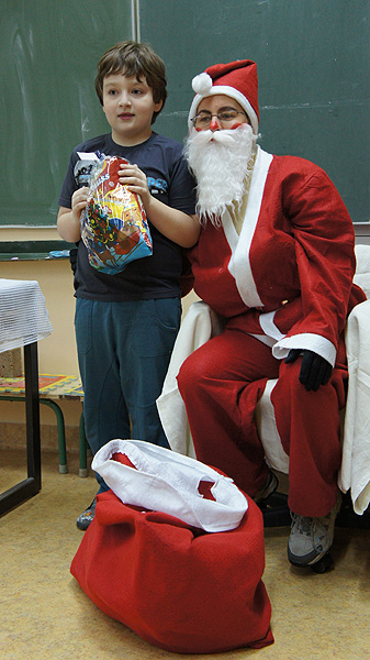 06.12.2012. Większość z nas dostała już prezenty od Mikołaja dzisiejszej nocy. Czekała nas jednak miła niespodzianka, kiedy w szkole na pierwszej lekcji pojawił się nikt inny jak On - a właściwie Ona - we własnej postaci - Pani Mikołaj. Nasze wprawne oko od razu to dostrzegło - to Mama Dominiki! No, ale ktoś musiał nam przekazać prezenty. Byliśmy przygotowani na ewentualną wizytę Mikołaja, więc odśpiewaliśmy piosenki, a potem cieszyliśmy się z pysznej zawartości naszych paczek. Było super fajnie!