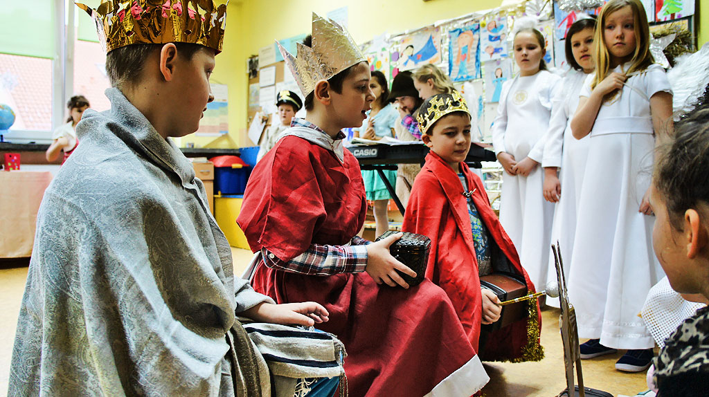19.12.2013. Dzisiaj w klasie gościliśmy naszych rodziców, aby mogli zobaczyć przedstawiane przez nas Jasełka. To już trzecia edycja w naszym wykonaniu więc i trema była mniejsza. Wprawdzie było parę małych wpadek, ale przecież nic się nie stało. Poprzebierani za postaci związane z Bożym Narodzeniem śpiewaliśmy kolędy i przedstawialiśmy fajne scenki Jasełkowe. Na koniec oczywiście otrzymaliśmy wielkie brawa. Zbliżają się Święta i da się już wyczuć świąteczną magię... WSZYSTKIEGO NAJLEPSZEGO!
