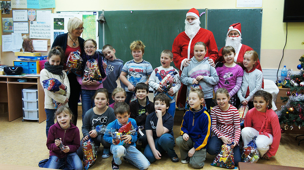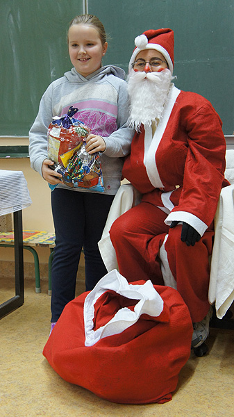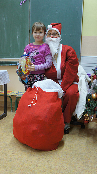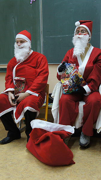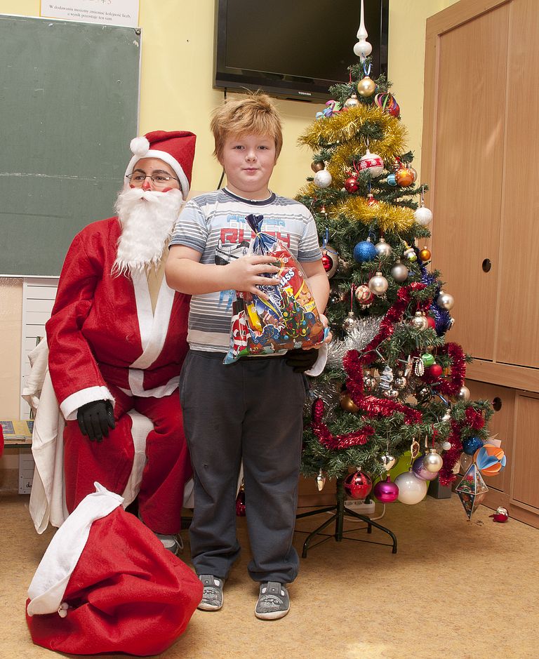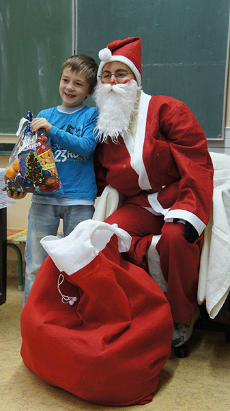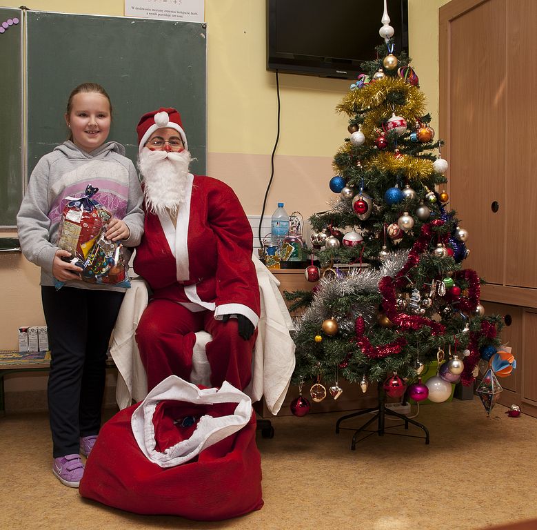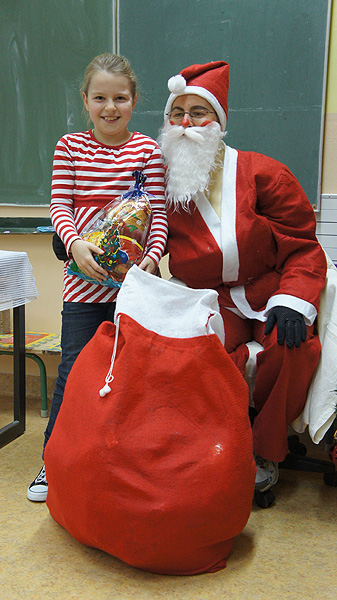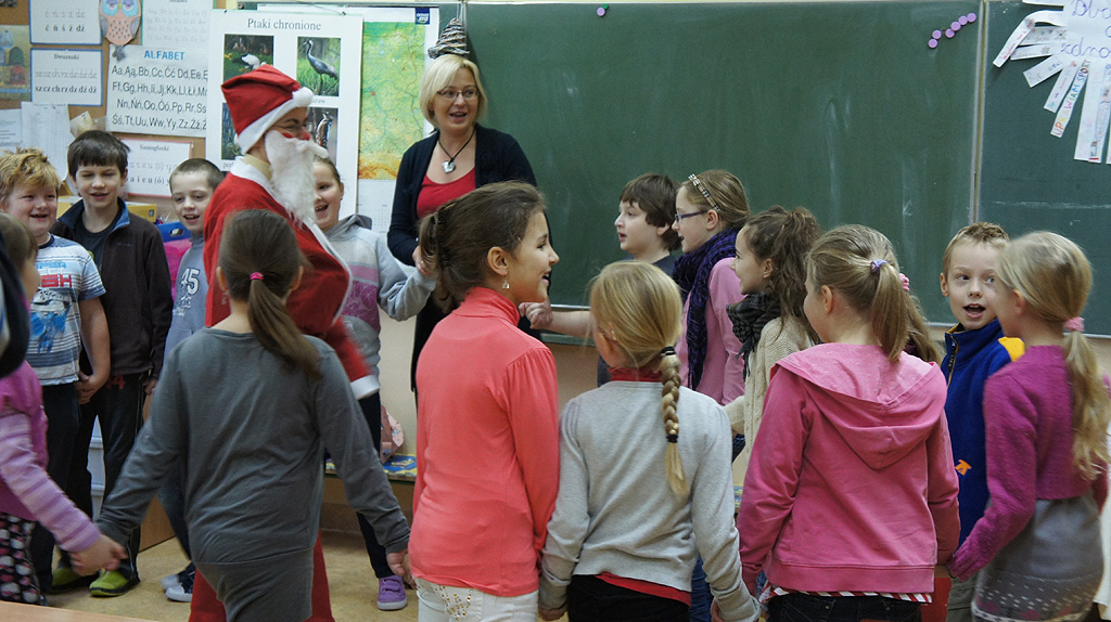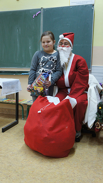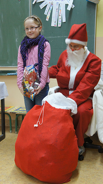 06.12.2012. Większość z nas dostała już prezenty od Mikołaja dzisiejszej nocy. Czekała nas jednak miła niespodzianka, kiedy w szkole na pierwszej lekcji pojawił się nikt inny jak On - a właściwie Ona - we własnej postaci - Pani Mikołaj. Nasze wprawne oko od razu to dostrzegło - to Mama Dominiki! No, ale ktoś musiał nam przekazać prezenty. Byliśmy przygotowani na ewentualną wizytę Mikołaja, więc odśpiewaliśmy piosenki, a potem cieszyliśmy się z pysznej zawartości naszych paczek. Było super fajnie!